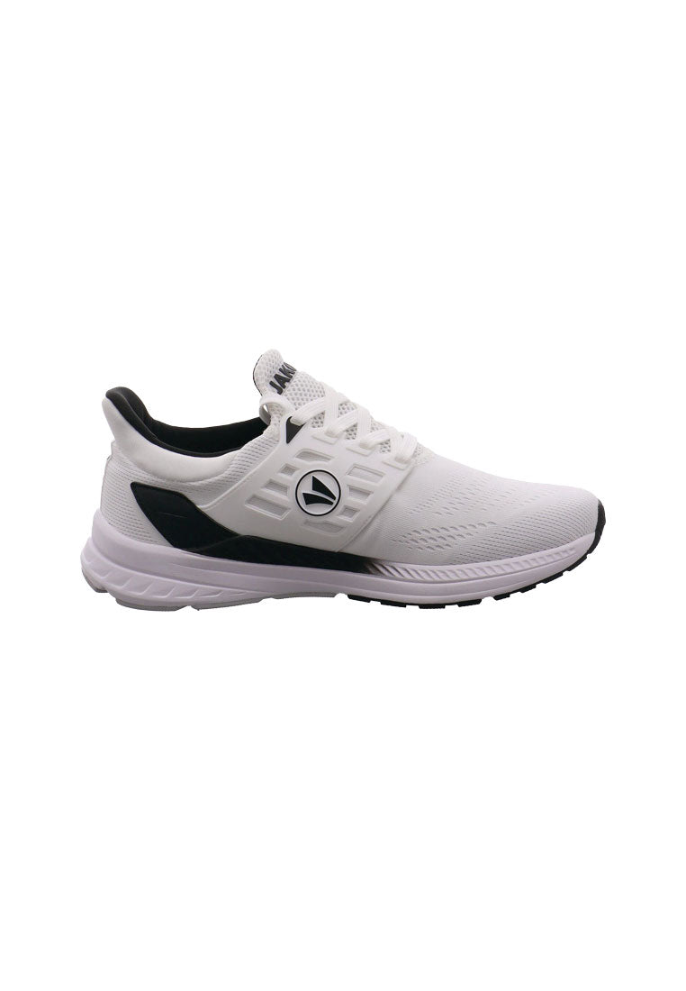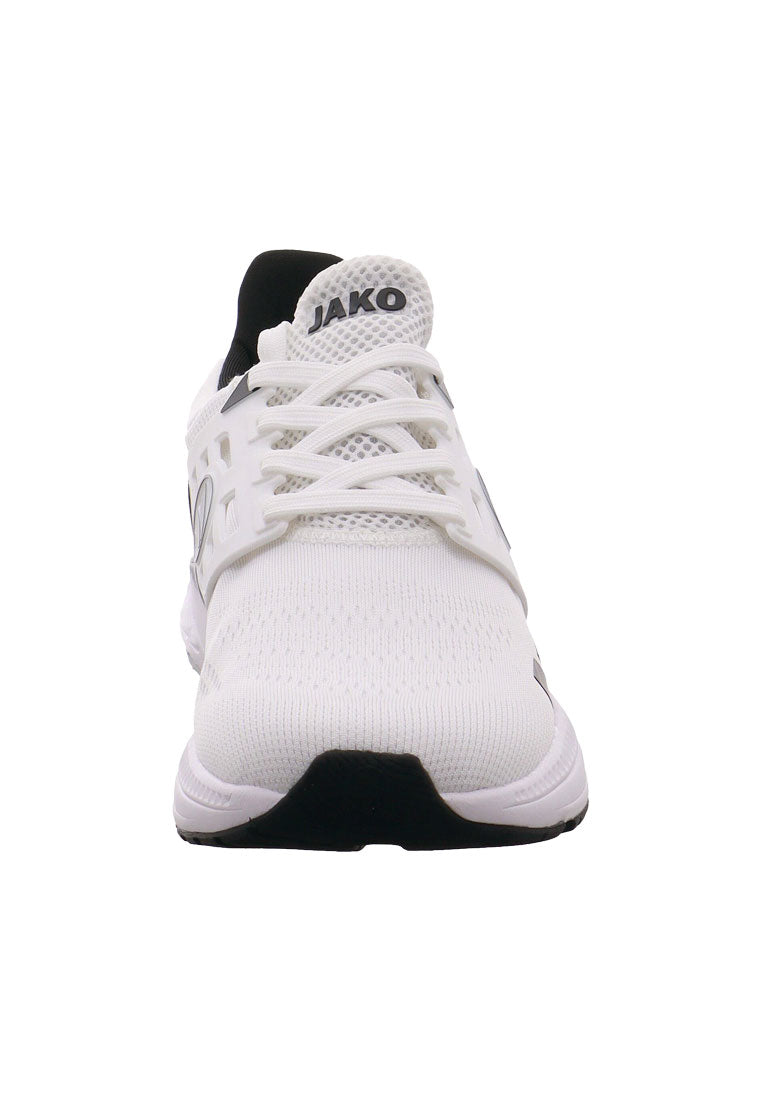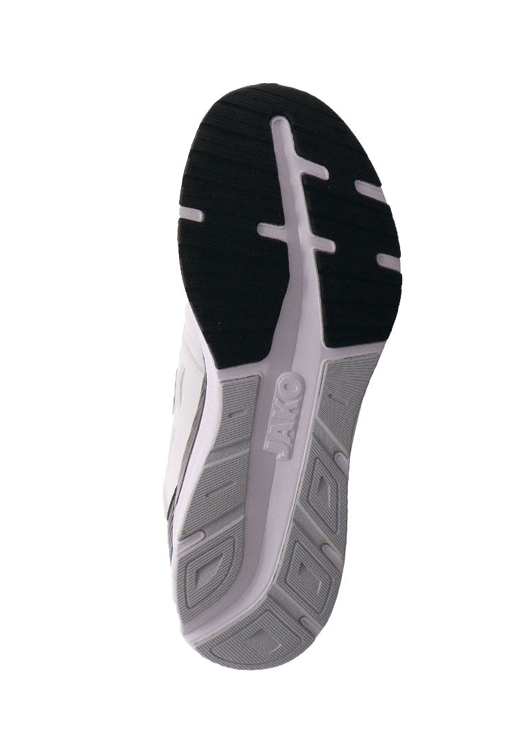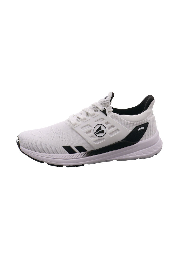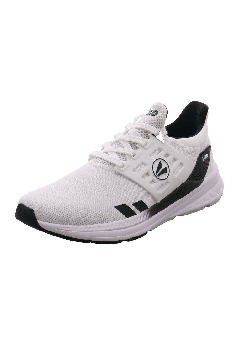 Der J-PR Smash ist ein sportlich, moderner Herren Sportschuh von Jako. Das Obermaterial ist aus einem Mix aus Air Flow Mesh in Weiß mit Schwarz und stabilisierenden Synthetik Einsätzen. Air Flow Mesh ist ein offenporiges Meshmaterial, das für sehr gute Atmungsaktivität sorgt. Durch die Schnürung ist ein leichter Einstieg möglich und der Schuh lässt sich optimal an den Fuß anpassen. Die ShockAbsorb EVA-Zwischensohle sorgt für optimale Energierückgewinnung bei jedem Schritt. Zudem hält die Fast Dry Lining Technologie den Fuß bei jeder Anstrengung trocken. Das Material ist schnelltrocknend und nimmt Schweiß effektiv auf und transportiert diesen weg von der Haut. Die ProGrip Rubber Außensohle in Weiß sorgt für gute Stabilität bei allen Bewegungen und zeichnet sich durch hervorragende Bodenhaftung aus. Sie überzeugt dabei außerdem durch ihre hohe Abriebfestigkeit auf nahezu allen Böden. Ein idealer Begleiter für Freizeit und Sport, zu einem tollen Preis-Leistungs-Verhältnis.